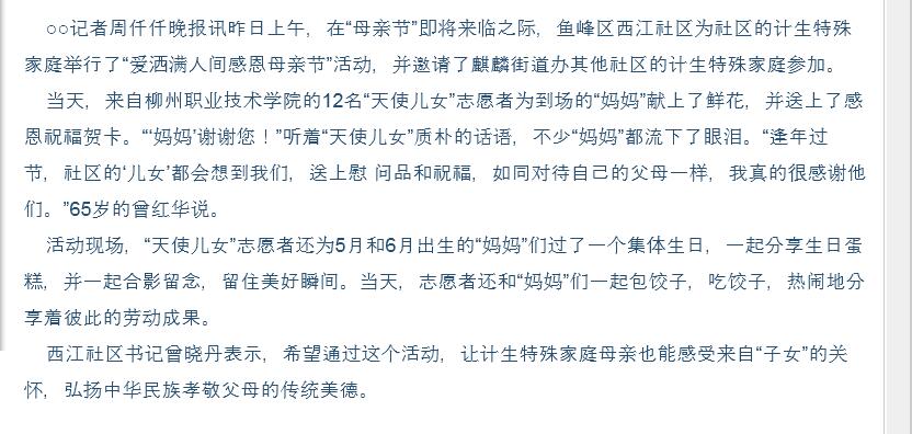 柳州晚报近日刊发我院大学生志愿者到社区与计生特殊家庭过母亲节的新闻