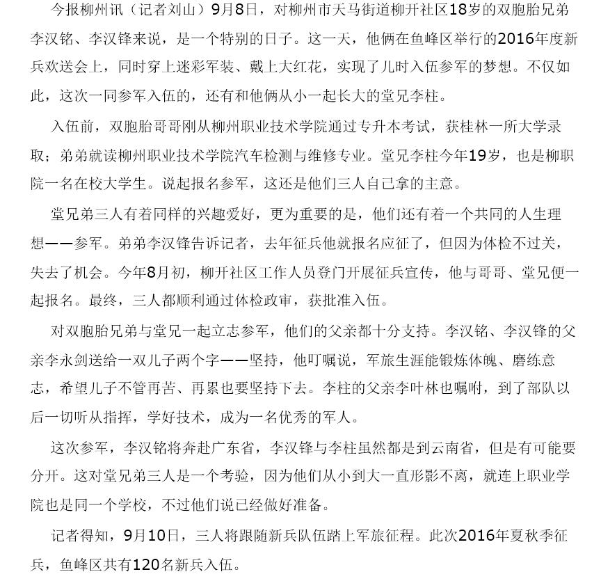 南国今报刊发我校毕业生参军的通讯 来源:柳州职业技术学院新闻网 作者:石玉丹 编审: 发布时间:2016-09-20 浏览次数: 次 【字体:小 大】 分享到: 2016年9月9日,南国今报在第11版,以“堂兄弟三人同日穿军装”为题,刊发我校毕业生参军的通讯。(截图:石玉丹) 关闭 打印正文