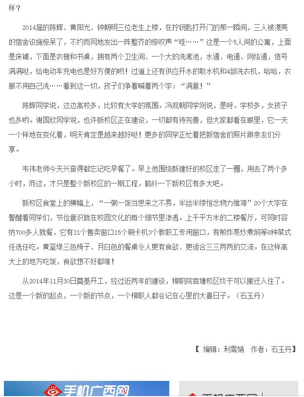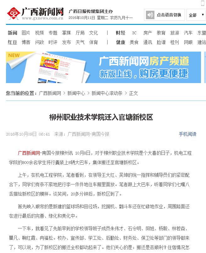 广西新闻网刊发我?;绻こ萄г貉崆ㄐ滦G男挛? 来源:柳州职业技术学院新闻网 作者:石玉丹 编审: 发布时间:2016-10-11 浏览次数: 次 【字体:小 大】 分享到: 2016年10月9日,广西新闻网以“柳州职业技术学院迁入官塘新校区”为题,刊发我?;绻こ萄г貉崆ㄐ滦G男挛?。(截图:石玉丹) 关闭 打印正文