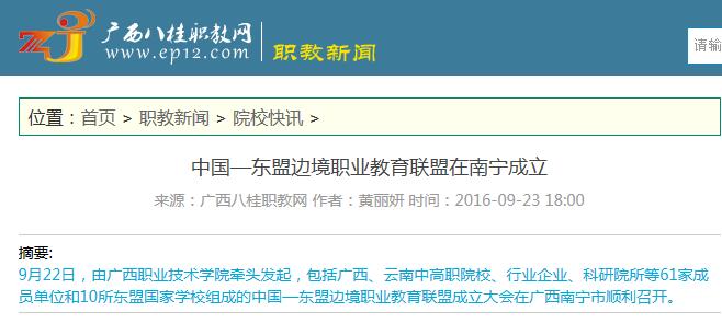 2016年9月23日,广西八桂职教网在院??煅独改浚浴爸泄?东盟边境职业教育联盟在南宁成立”为题,刊发了9月22日,由广西职业技术学院牵头发起,包括广西、云南中高职院校、行业企业、科研院所等61家成员单位和10所东盟国家学校组成的中国-东盟边境职业教育联盟在南宁召开成立大会的新闻?;嵘?,我校校长石令明和与会领导在主席台上共同开启水晶球按钮。详情点击: http://www.ep12.com/plus/view.php?aid=42777 (截图:石玉丹)