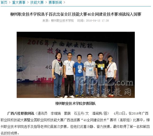 2016年4月15日,八桂职教网刊发我校选手首次出征全区技能大赛4G全网建设技术赛项就闯入国赛的新闻。详情点击: http://www.ep12.com/a/zhongdasaishi/jinendasai1/saishixinwen/2016/0415/40369.html(截图:石玉丹)