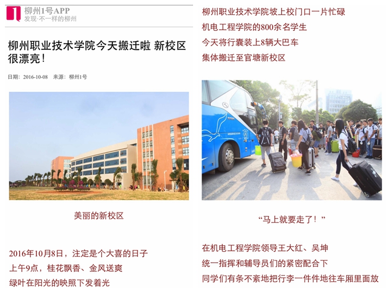2016年10月8日,柳州1号APP以“柳州职业技术学院今天搬迁啦 新校区很漂亮!”为题,发布我校机电工程学院学生搬迁新校区的新闻。(新闻截图:唐艳)