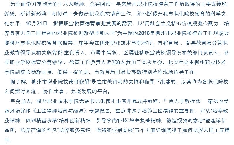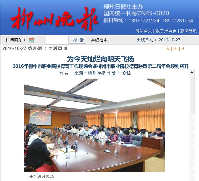 2016年10月27日,柳州晚报在第26版,以“为今天灿烂 向明天飞扬”为题,刊发我校举办2016年柳州市职业院校德育工作现场会暨柳州市职业院校德育联盟第二届年会的新闻。(截图:石玉丹)详情请点击:http://www.lznews.gov.cn:9999/epaper/lzwb/html/2016/10/27/26/default.htm
