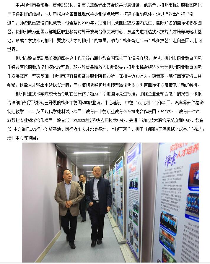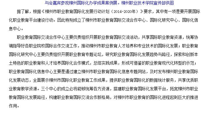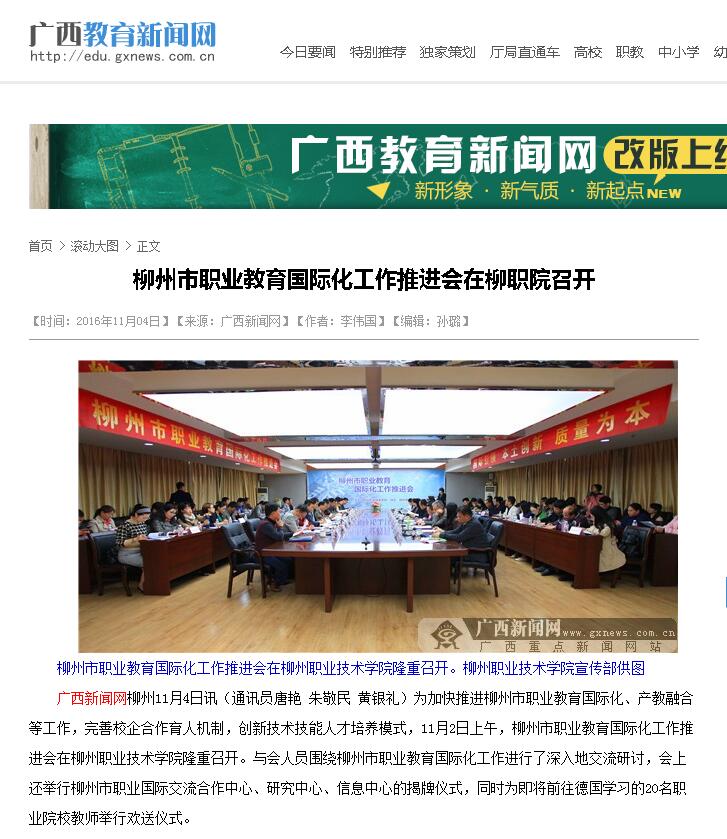 【广西新闻网】《柳州市职业教育国际化工作推进会在柳职院召开 来源:柳州职业技术学院新闻网 作者:石玉丹 编审: 发布时间:2016-11-07 浏览次数: 次 【字体:小 大】 分享到: 2016年11月4日,广西新闻网刊发柳州市职业教育国际化工作推进会在我校召开的新闻。(截图:石玉丹) 关闭 打印正文