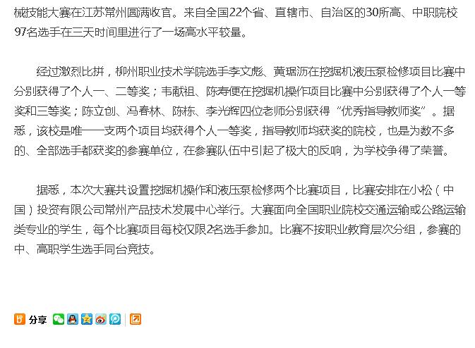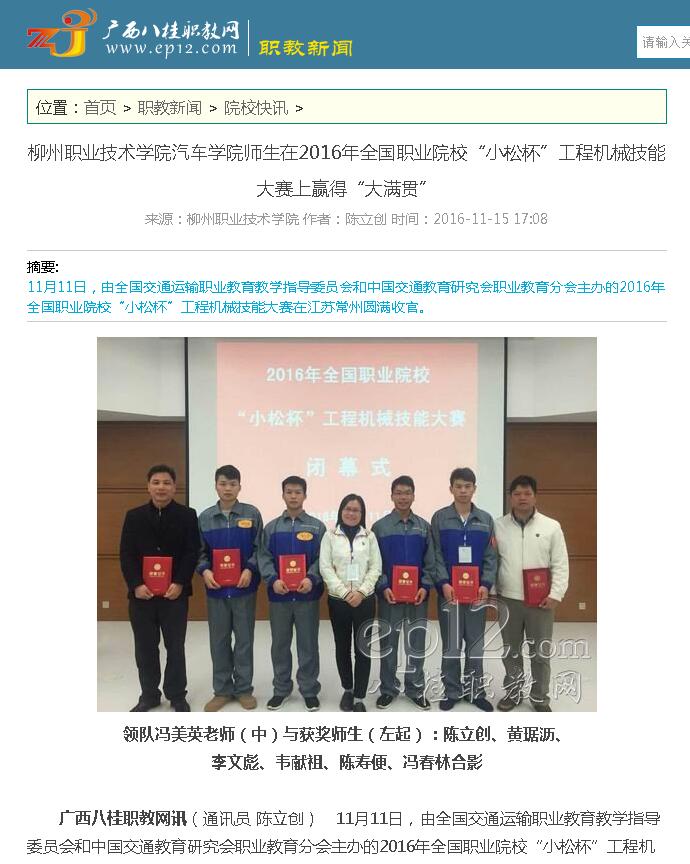 【广西八桂职教网】柳州职业技术学院汽车学院师生在2016年全国职业院校“小松杯”工程机械技能大赛上赢得“大满贯”