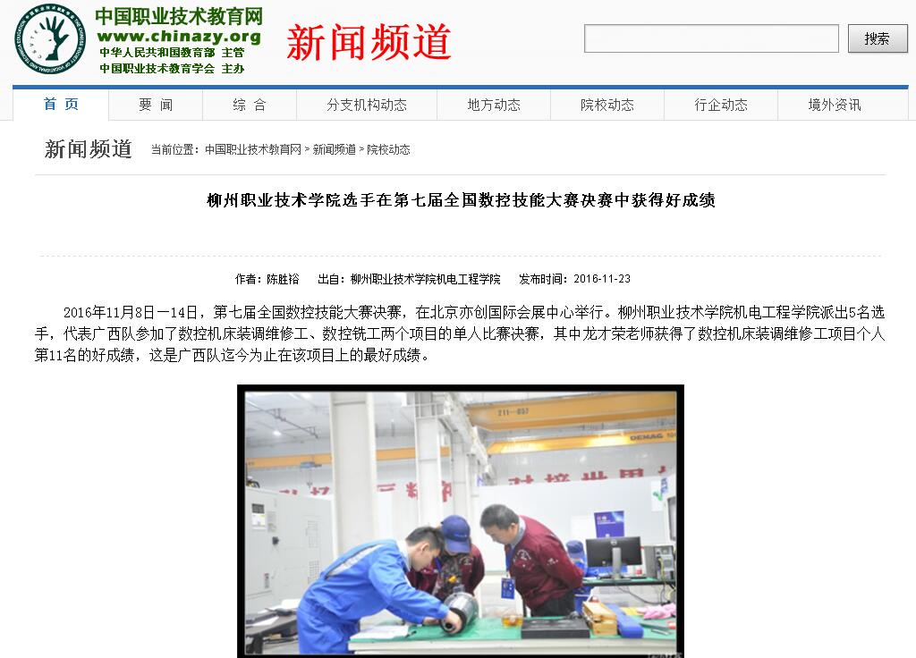 2016年11月23日,中国职业技术教育网在新闻频道-院校动态栏目,刊发我校选手在第七届全国数控技能大赛决赛中获得好成绩的新闻。详情点击:http://www.zjchina.org/platform/service/zxnews/shtml/201611/10730.shtml(截图:石玉丹)