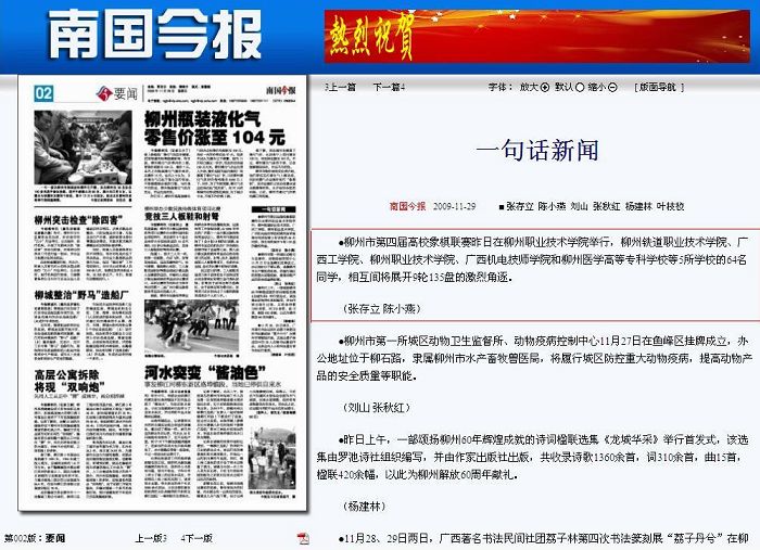 2009年11月28日,《南国今报》报道柳州市第四届高校象棋联赛在我院举行的新闻。(图/蒋玉梅)