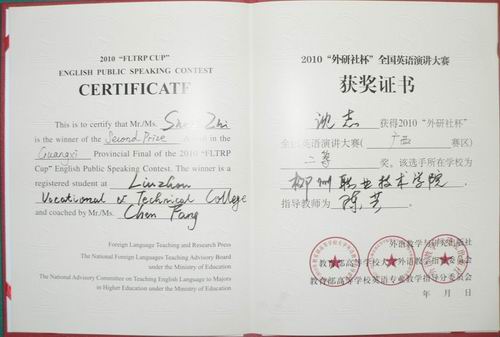 2010年11月20日至21日,2010年“外研社杯”全国英语演讲大赛广西赛区复赛在广西医科大学举行,我院选手沈志、韦富天两位同学在陈芳、甘丽红两位指导老师的带领下参加了比赛,并分别获得二、三等奖,我院获得专科组团体二等奖,创造了我院在该项赛事中的最好成绩。