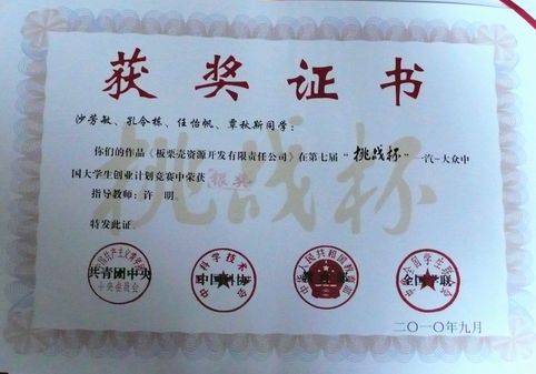 2010年9月25日至29日,由共青团中央、中国科协、教育部、全国学联等主办的第七届“挑战杯”中国大学生创业计划竞赛决赛在吉林大学圆满落幕,我院由许明、邓亮顺、潘峰、杨小浒、王姗姗老师指导的《板栗壳资源开发有限责任公司》学生创业团队经过书面评审、网络虚拟运营、秘密答辩三个环节的比赛喜获银奖,取得历史性的突破,成为第一个也是唯一一个站在挑战杯创业大赛领奖台上的高职高专院校,并在网络虚拟运营环节以第一名的成绩获得最佳表现奖,由于表现优秀还获得校级优秀组织奖,成为我院办学历史上又一项标志性获奖成果,实现历史性突破。
