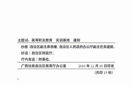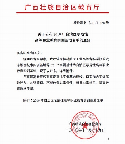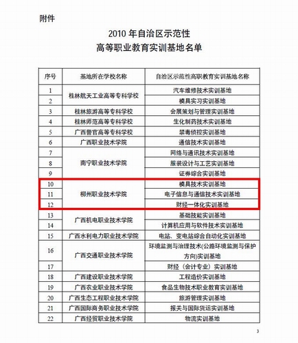 2010年12月30日,广西壮族自治区教育厅印发了桂高教【2010】166号文件《关于公布2010年自治区示范性高等职业教育实训基地名单的通知》(以下简称《通知》),《通知》上认定包括我院模具技术实训基地、电子信息与通信技术实训基地和财经一体化实训基地在内的全区各院校共25个实训基地为自治区示范性高等职业教育实训基地。