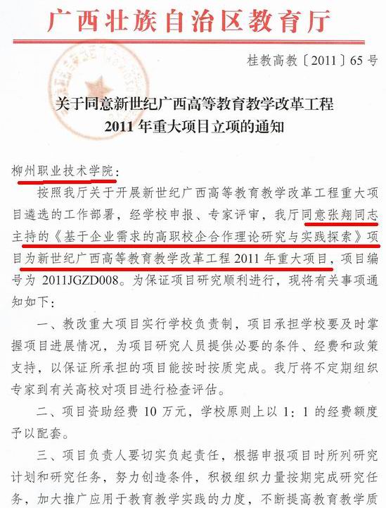 日前,广西教育厅公布《关于同意新世纪广西高等教育教学改革工程2011年重大项目立项的通知》(桂教高教〔2011〕65号),我院主持或参与的2个项目获得立项。由我院张翔副院长主持的《基于企业需求的高职校企合作理论研究与实践探索》获项目资助经费10万元,同时参与由南宁职业技术学院牵头组织的《高职院校单独招生选拔测试体系的研究与实践》项目研究。
