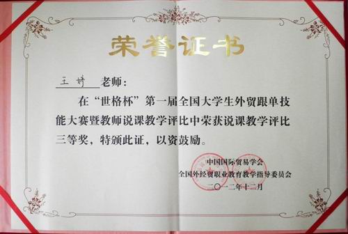 11月30日—12月2日,由中国国际贸易学会和全国外经贸职业教育教学指导委员会主办的“第一届全国大学生外贸跟单技能大赛暨教师说课教学评比”比赛在江苏经贸职业技术学院举行。我院贸易与旅游管理系以谭欣副主任为组长,以教师王婷和张蓓为组员的参赛团队喜获教师说课教学评比大赛三等奖。