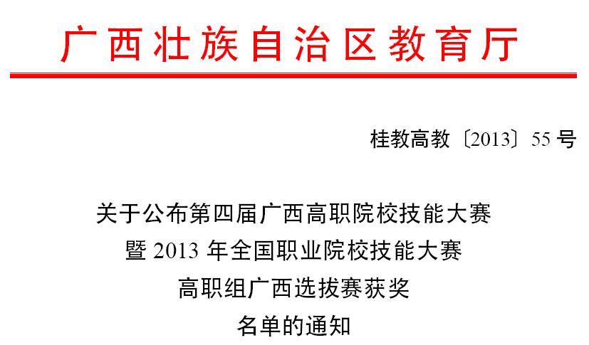 由区教育厅在2013年5月7日-11日主办的第四届广西高职院校技能大赛已圆满落幕,经过全区47所高职院校1034名高手们的比拼和比赛组委会的审定,比赛结果最终敲定。我院共派出33名学生参加14个竞赛项目的角逐,其中集体项目获得2个一等奖、6个二等奖,个人项目5人获得一等奖,1人获得二等奖,2人获得三等奖。(文、图/ 陈冰梅)