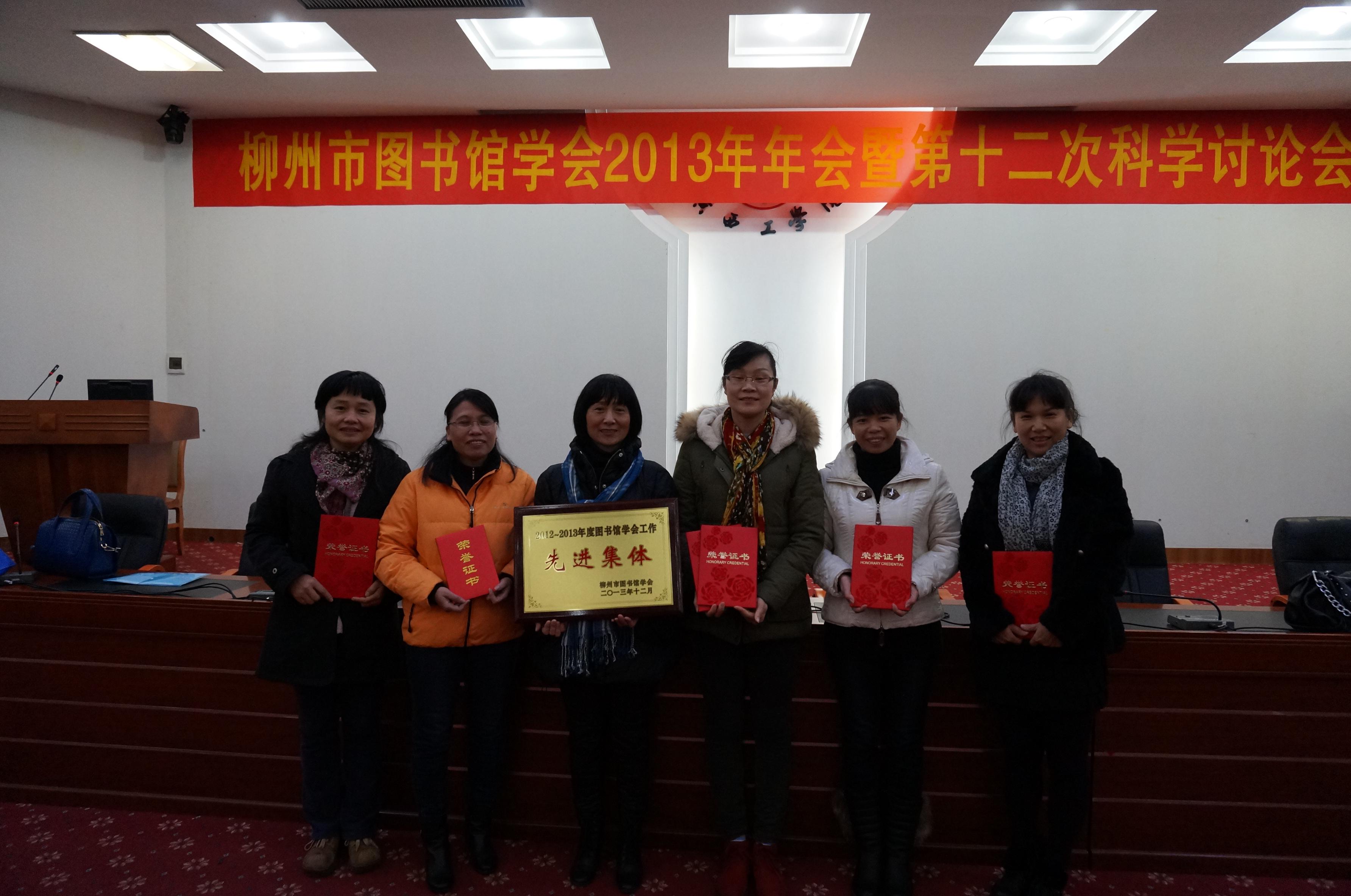 柳州市图书馆馆长向会议作柳州市图书馆学会2012-2013年工作总结,并进行第十二次科学讨论会论文及第一届优秀成果点评;第一届优秀成果奖代表在会上发言,会议还颁发了柳州市图书馆学会第十二次科学讨论会获奖论文证书、柳州市图书馆学会第一届优秀成果奖和2012-2013年度基层图书馆先进个人、先进集体奖。我院图书馆获得基层图书馆先进集体荣誉称号,刘静春、林爱鲜、李燮慧、韦莉娟、陈丽云等5人共9篇论文获得柳州市图书馆学会第一届优秀成果三等奖,这是历年来我院图书馆获得市一级论文奖项最多的一次。李燮慧、梁荻被评为柳州市图书馆学会2012-2013年度基层图书馆先进个人。