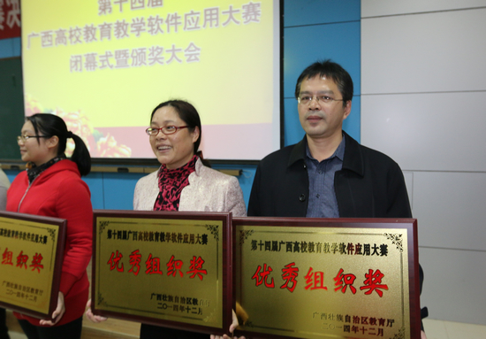 新闻网消息(通讯员 教务处 林宁 摄影 现教中心 黎飞)11月29日至30日,第十四届广西高校教育教学软件应用大赛现场决赛在广西师大隆重举行。我院十三件作品获奖,分别取得一等奖5项,二等奖5项,三等奖3项,优秀奖5项和优秀组织奖1项,是我院在该项赛事获奖总数最多的一年。我院鞠红霞副院长在颁奖仪式上接过了交接杯——2015年第十五届广西高校教育教学软件应用大赛将由我院承办。