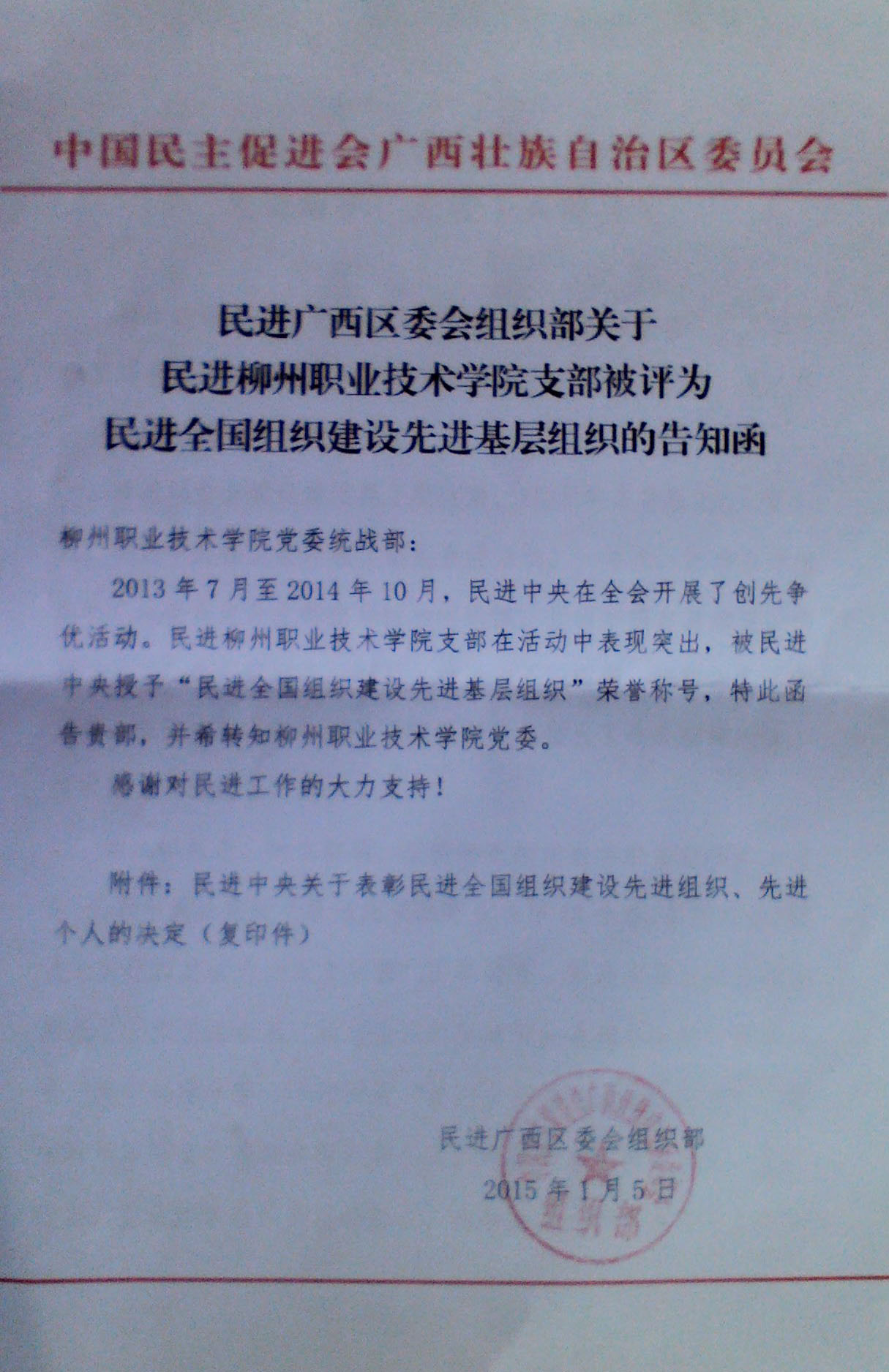 新闻网消息(记者 古志华)近日,从民进广西区委组织部获悉,民进柳州职业技术学院支部在2013年7月至2014年10月,民进中央在全会开展的创先争优活动中表现突出,获得民进中央授予“民进全国组织建设先进基层组织”荣誉称号,成为民进柳州市委31个基层党支部中唯一获此殊荣的基层组织。