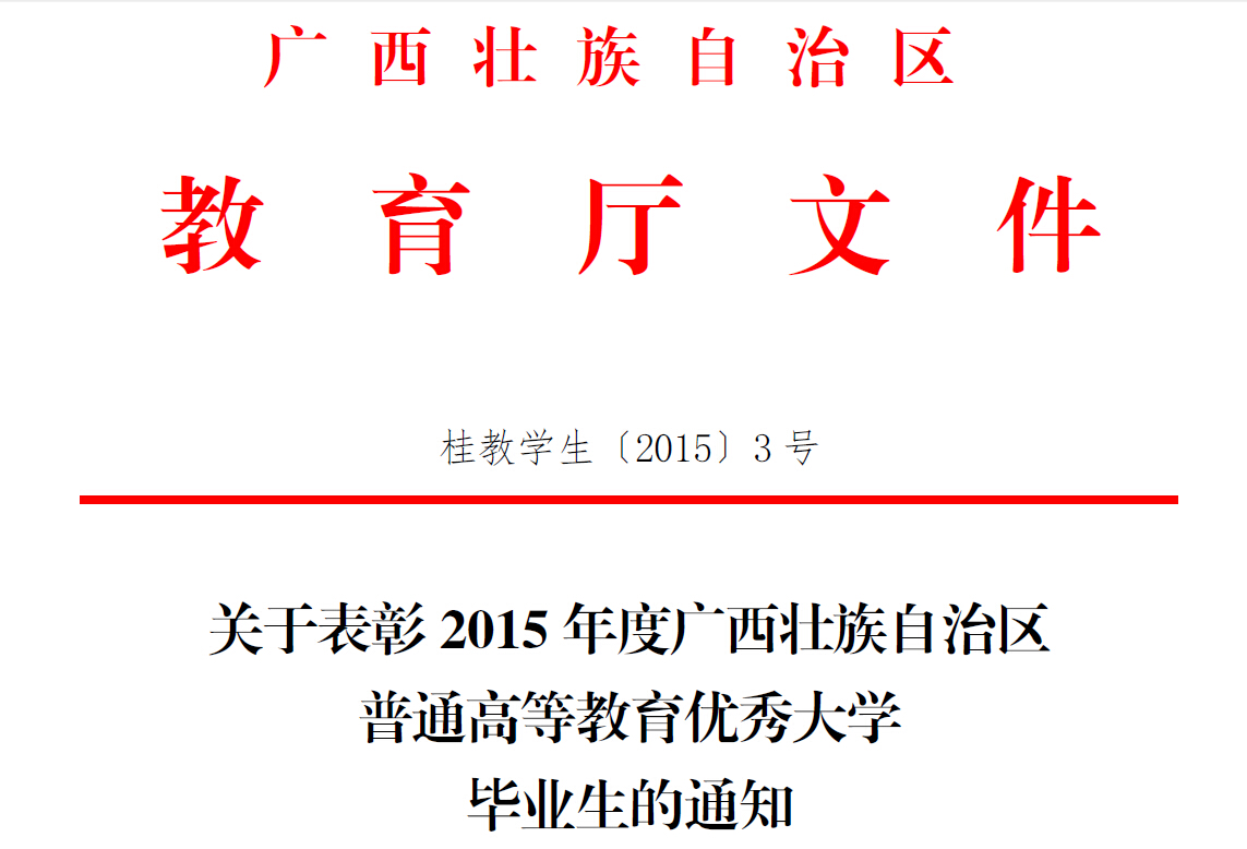 优秀大学生是大学生中品德优秀、成绩优异、积极践行社会主义核心价值观的优秀学生,是全区大学生的学习榜样。自治区教育厅高等学校对优秀大学毕业生评选进行了严格的审查,最终确定1968名大学生为“2015年度广西壮族自治区普通高等教育优秀大学毕业生”。我院获得此项荣誉的35名同学分别是:何秀辉、麦考威、黄永辉、陆阶德、黄园、农志升、张月泽、李少新、蒙碧珊、陆飞霞、韦尤近、蔡蕊蔓、吴婷婷、郑京、卓新银、谭志荣、翁敏、董海涛、韦露、 周志海、李佳棋、戴秋燕、黎芳兰、莫志亮、廖翠英、龚柳华、梁坤芳、莫耀、王善威、韦超、韦丽萍、徐从军、杨涛、张浩、钟声。