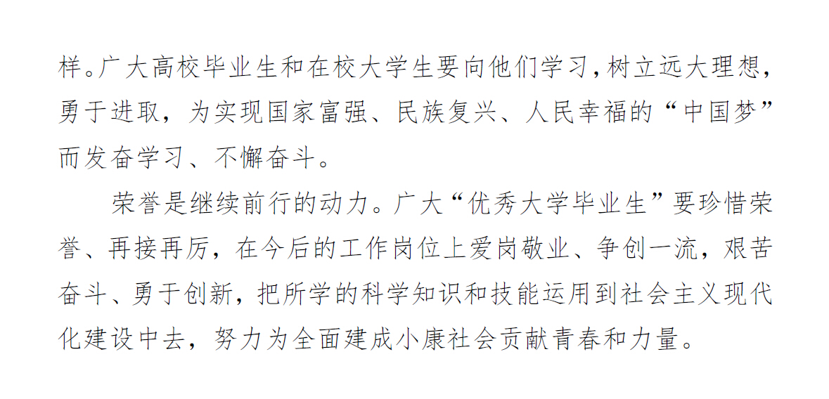 希望受表彰的同学戒骄戒躁、勤奋进取,在未来的工作岗位上爱岗敬业、艰苦奋斗、争创一流,运用所学的知识和技能,实现自己的理想,回报社会,也希望广大在校生以获得表彰的优秀毕业生为榜样,严格要求自己,树立远大理想,脚踏实地、锐意进取,努力为实现中国梦贡献自己青春和力量。