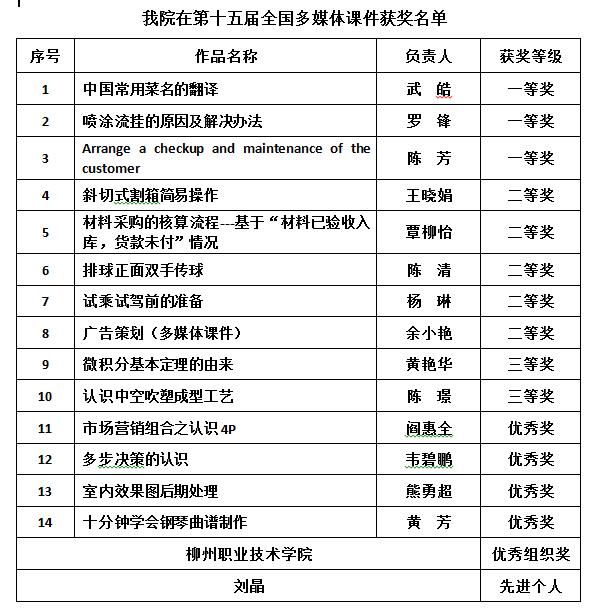 新闻网消息(通讯员/教务处 刘晶)近日,由教育部教育管理信息中心主办的第十五届全国多媒体课件大赛获奖名单揭晓,我院获一等奖3项、二等奖5项、三等奖3项、优秀奖4项、先进工作者1名和优秀组织奖的好成绩。