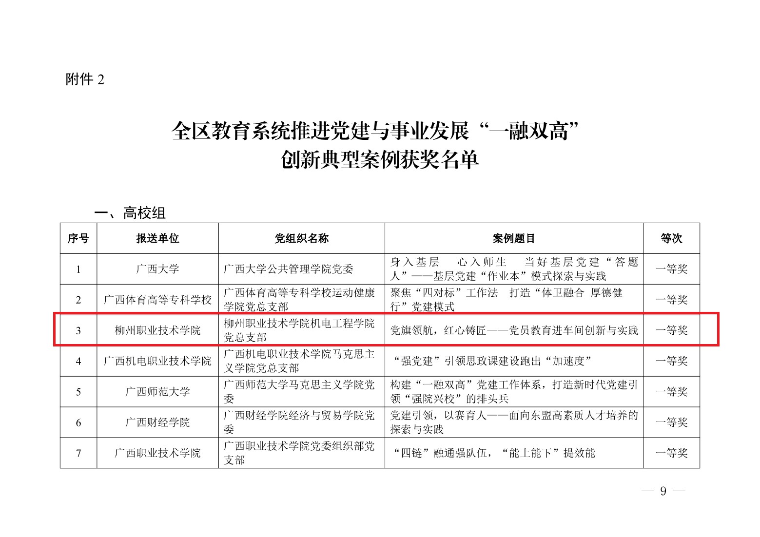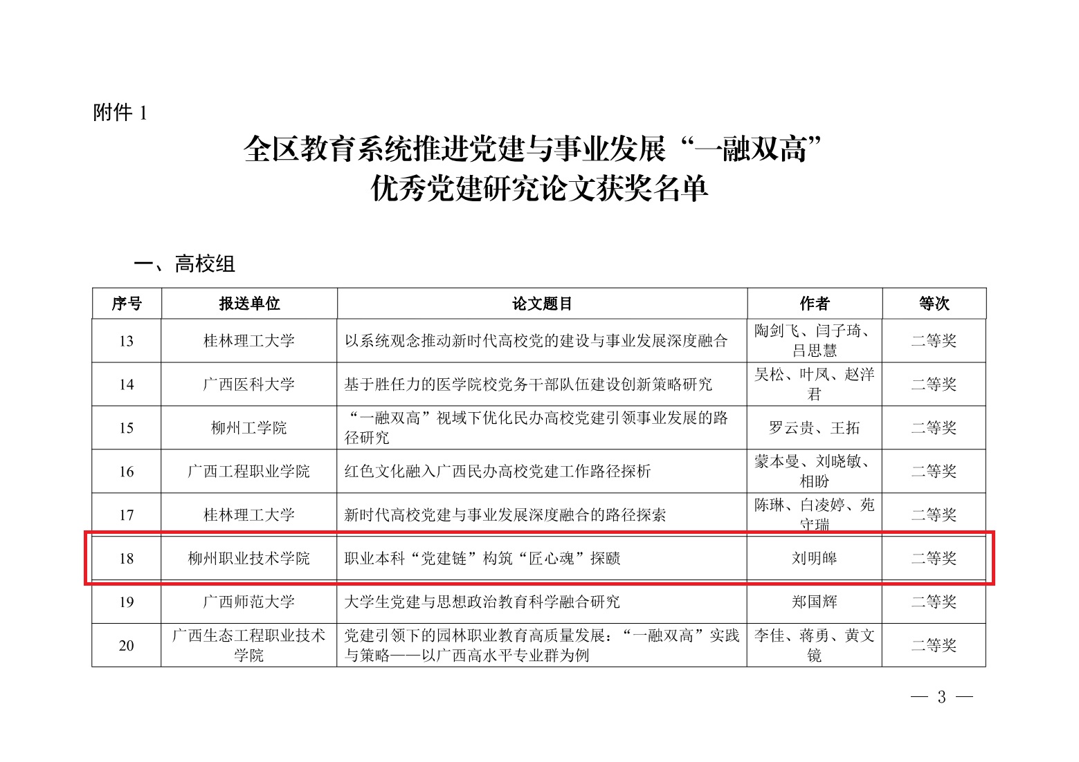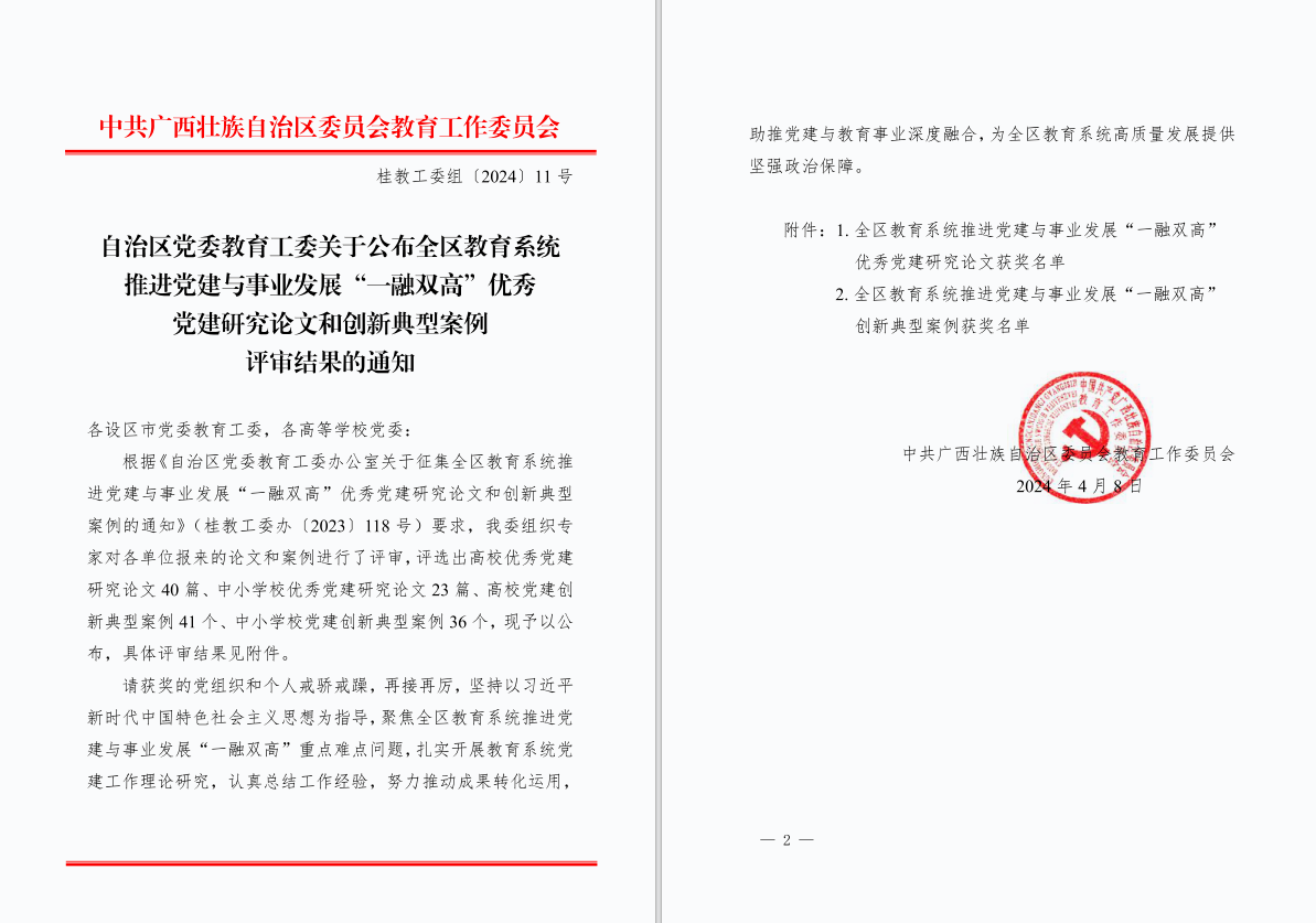 新闻网消息(文、图/党委组织部(统战部) 覃正海)近日,根据自治区党委教育工委印发的《关于公布全区教育系统推进党建与事业发展“一融双高”优秀党建研究论文和创新典型案例评审结果的通知》(桂教工委组〔2024〕11号)文件获悉,我校共有3个作品获奖,其中创新典型案例一等奖1个、优秀党建研究论文二等奖1篇、三等奖1篇。