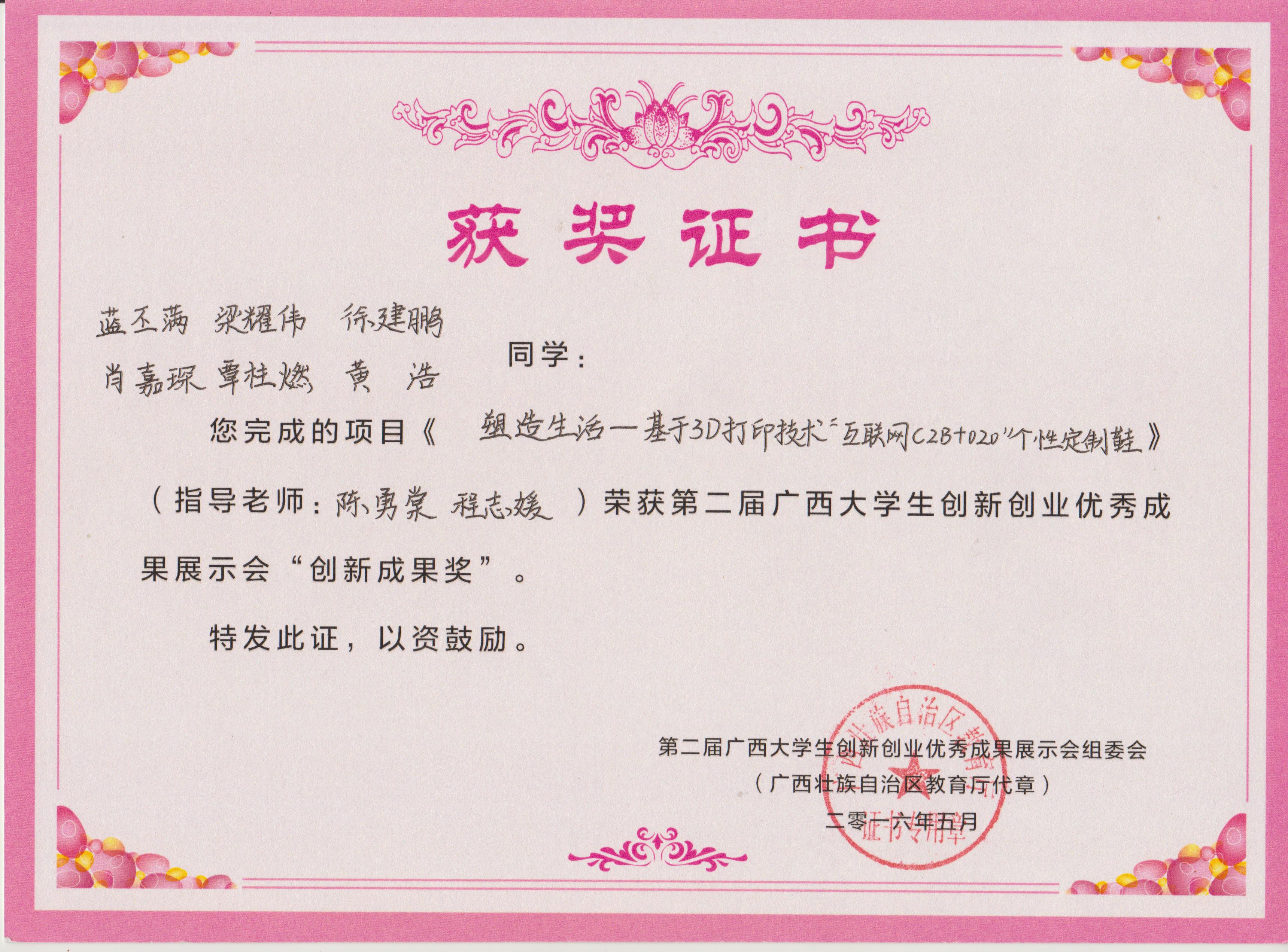 此次展会由广西教育厅主办、广西财经学院承办,共有来自65所高校的560多名师生带来202个项目参加展示和交流,全区各高校负责人、项目评审专家、观摩师生代表、优秀企业家代表等近2000人参会。我院得《塑造生活——基于3D打印技术的“互联网C2B+O2O”个性定制性》(指导老师:陈勇棠、程志媛》和《“网络之声”听觉浏览器》(指导老师:许明)两个项目参展,它们都是去年参加比赛荣获大奖的,前者参加中国首届“互联网+”创新创业大赛广西赛区荣获银奖,后者参加2015年大学生微创业行动评比并荣获金奖。