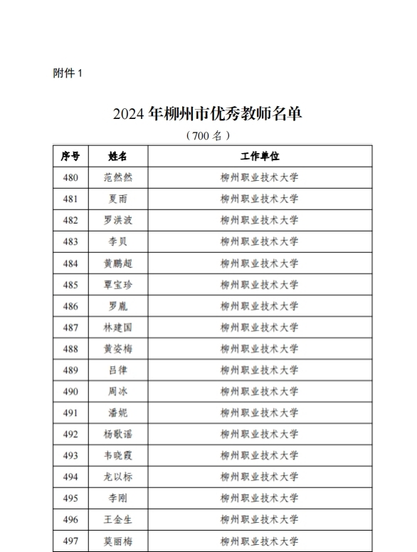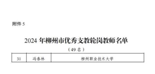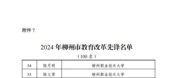 新闻网消息(文、图/人事处(党委教师工作部、教职工发展中心) 杨婉珍)根据柳州市教育局《关于表扬2024年柳州市优秀教师、优秀教育工作者、优秀班主任(辅导员)、师德模范、优秀支教轮岗教师、优秀责任督学、教育改革先锋的通知》(柳教人〔2024〕22号),对我校范然然、夏雨、罗洪波、李贝、黄鹏超、覃宝珍、罗胤、林建国、黄姿梅、吕律、周冰、潘妮、杨歌谣、韦晓霞、龙以标、李刚、王金生、莫丽梅等18位柳州市优秀教师;蓝纤纤、韦伟、韦益良、宋杨菲、郝华杰等5位柳州市优秀班主任(辅导员);李东恒、曾志、韦碧鹏、刘明皞、罗利杰等5位柳州市优秀教育工作者;吴坤、韦壮、范海静等3位柳州市师德模范;柳州市优秀支教轮岗教师冯春林,以及陈月明、陈文勇等2位柳州市教育改革先锋给予表扬。