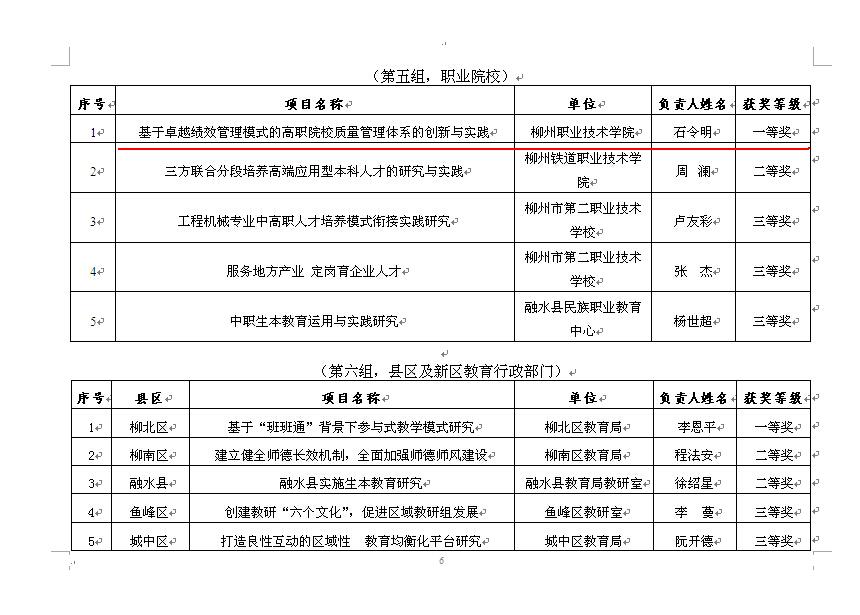 新闻网消息(通讯员/质量办 张慧敏 摄影/覃日娜)近日,柳州市教育局公布了2015年“柳州市教育改革创新奖”评选结果,我院申报的管理改革创新项目“基于卓越绩效管理模式的高职院校质量管理体系的创新与实践”获职业院校组一等奖。