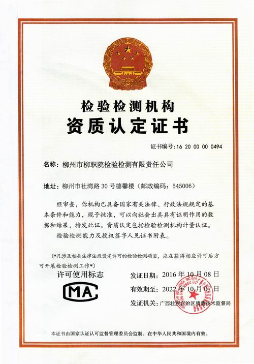 喜讯:柳州市柳职院检验检测有限责任公司CMA实验室获得检验检测机构资质认定证书