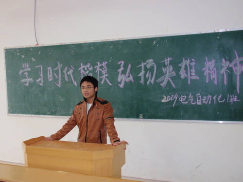 2010年3月29日上午,2009级电气自动化技术1班在竞择楼708教室开展了关于学习长江英雄先进事迹的主题班会,班会由梁琨同学主持。