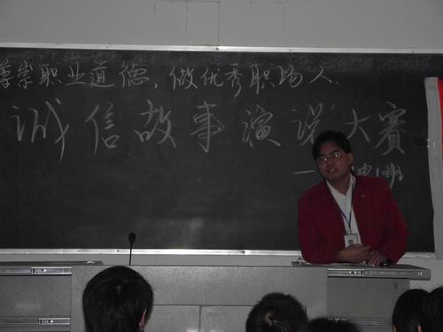 比赛中,主持人以公务员泄题事件为例引入诚信这一主题。接着,班级中的各选手们各展风采,一一上台进行故事演说,他们或以正反两面事例进行鲜明对比,或以身边的例子,或引用典故从多角度多方面道出了诚信在职场上的关键作用。选手们的故事生动有趣,选材合理恰当,富有哲理,演讲抑扬顿挫,饱含感情,尤其是杨永斌同学铿锵有力的演说将比赛推向了高潮。每一个故事如同一颗明亮的珍珠,将诚信这一道德品质的重要性诠释得深刻而全面。