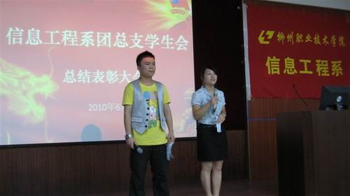 2010年6月25日下午,信息工程系在德馨楼101教室举行了团总支、学生会总结表彰大会。出席本次大会的有学生专干冯昌宇老师、系学生党支部书记龙思珍老师、系团总支书记廖菲玲老师、辅导员杨冬燕老师。