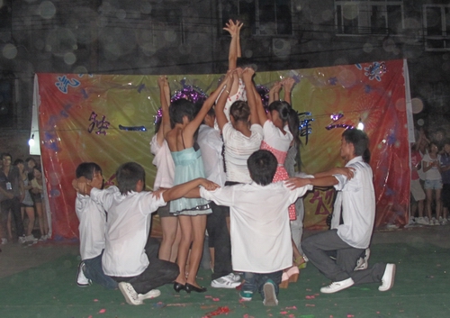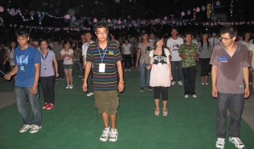 随着快乐熟悉的音乐——《兔子舞》响起,现场立即变成舞动的海洋,在场下的同学立即加入到场上的队伍,挥动着有节奏的节拍,新老生合群起舞,大家手搭肩膀编织出一个快乐而祥和的幸福圈。恰恰舞蹈让大家心情振奋;慢三步舞、民族歌曲、拉丁舞、草裙舞更是精彩不断,舞池的观众变得更加活跃起来,舞会的气氛一次次被推向了高潮?;鹑扔胩竦谖惶?,激情与高雅相伴而行,伴着柔和的晚风,在欢乐中、舞动中舞会落下帷幕。