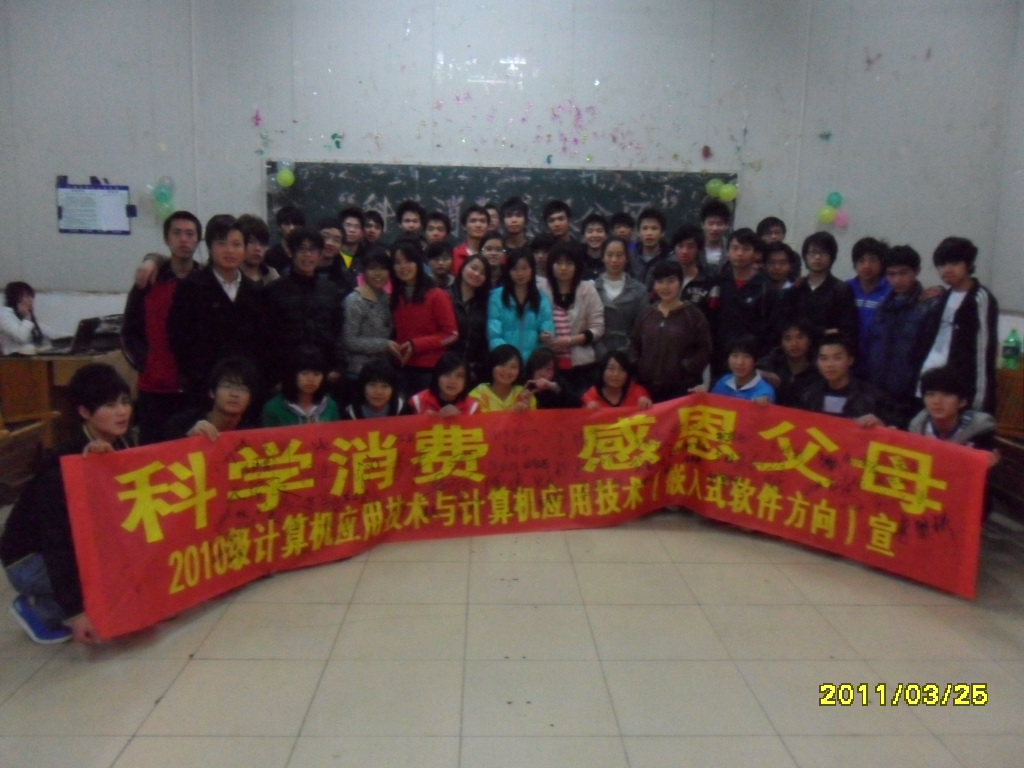 2011年3月25日晚,信息工程系2010级计算机应用技术班与2010级计算机应用技术(嵌入式软件方向)班在德润楼404以联欢晚会的形式,共同举办了“倡导科学消费 立志感恩父母”的主题教育活动。