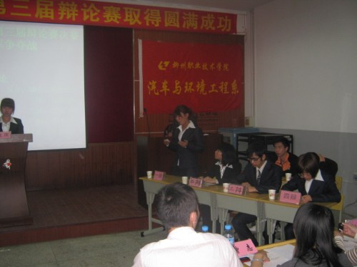 为了丰富同学们的课余生活,充分发挥个人才能、展现团队合作能力、增进各班间交流,2011年4月17日晚,汽车与环境工程系第三届大学生辩论赛决赛在德馨楼101举行。该系学生专干曾志、覃柳青、分团委书记蓝杜骞和所有辅导员应邀担任了此次辩论赛决赛评委。