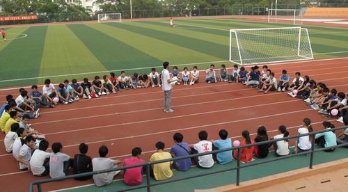 为了培养默契和团队精神,同学们随机分成了六个小组 ,随着音乐的响起,各组长带领其组员入场?;疃豢季桶哑找敫叱?,整齐的队伍伴随着响亮的口号,无不显示着同学们的热情。