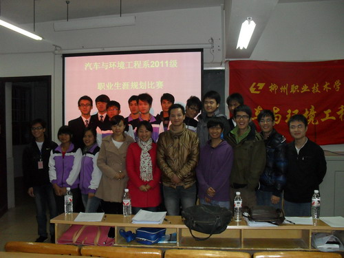 2011年12月2日晚,汽车与环境工程系举办了2011级新生职业生涯规划大赛。该系分团委书记蓝杜骞老师,学生专干曾志老师及刚参加完全国职业生涯规划大赛广西分赛区比赛的四位同学担任此次大赛评委。该系2011级的15名选手参加了此次比赛。