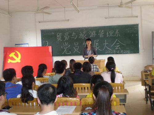 贸易与旅游管理系自成立以来,领导高度重视学生党员发展工作,本着“坚持标准,保证质量,改善结构,慎重发展”的原则,系学生党支部1支部和2支部于2012年4月20日下午召开了第一次学生党员发展大会,讨论2010级第一批发展对象入党问题。出席大会的有系教工党员,学生党员,发展对象及各班的入党积极分子。