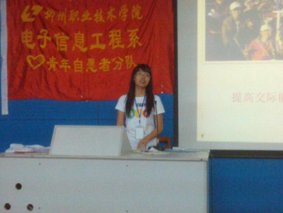 2012年5月6日晚,电子信息工程系青年志愿者服务分队在思贤楼旧阶梯教室举行“承志愿服务精神,创志愿服务先锋”为主题的青年志愿者入队宣誓活动。该系分团委副书记陆佳慧,院青年志愿者服务总队副部长秦振保、各级学生组织负责人及200余名志愿者参加此次活动。