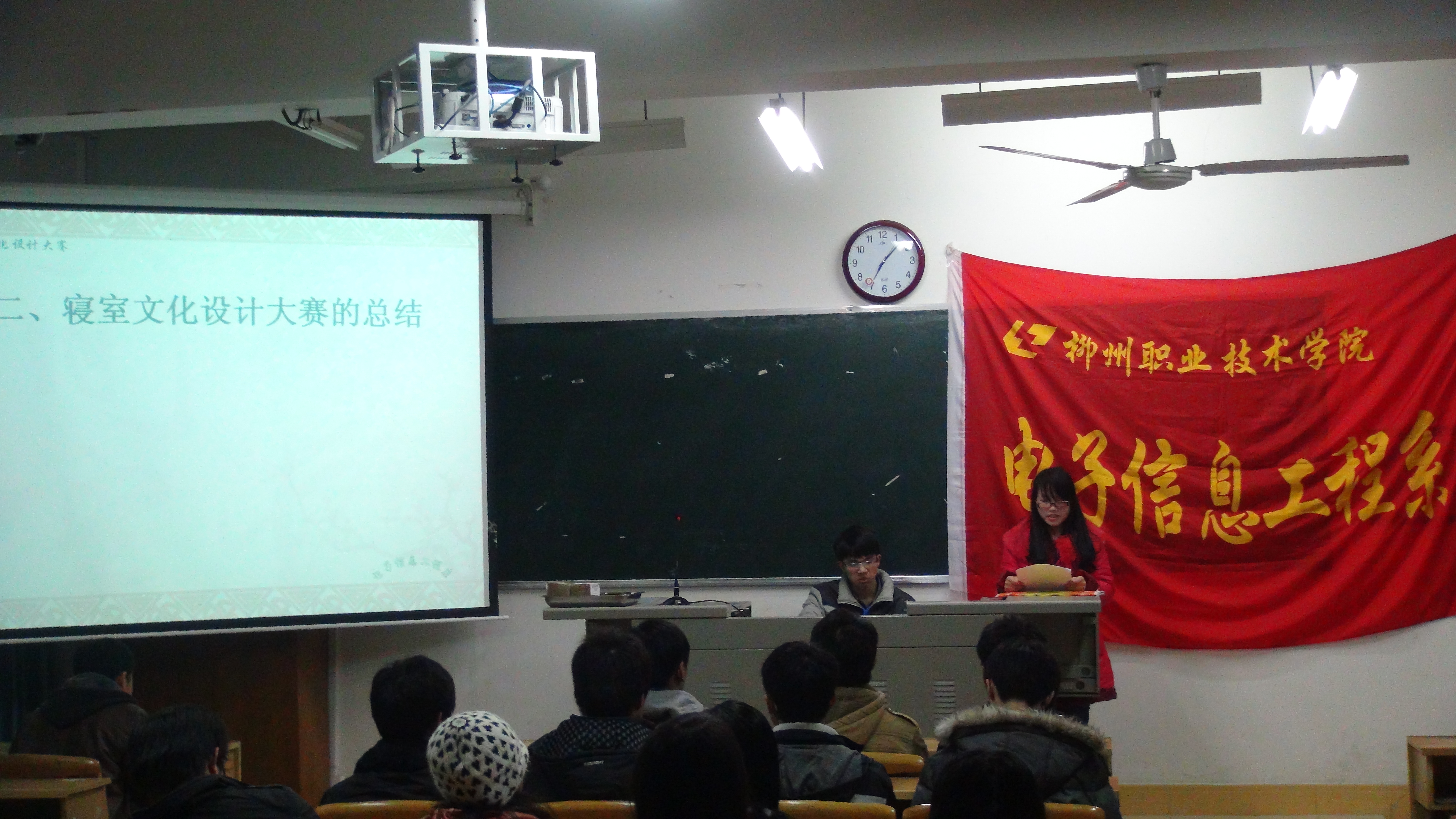 2013年1月15日晚7:00,电子信息工程系于博闻楼604教室举行了2012-2013年上学期电子信息工程系寝室文化设计大赛颁奖仪式。该系分团委学生会副书记周力、主席谢聪南、副主席苏晓明出席仪式,仪式由该系团委学生会生活部举办,颁奖典礼由生活部干事主持。