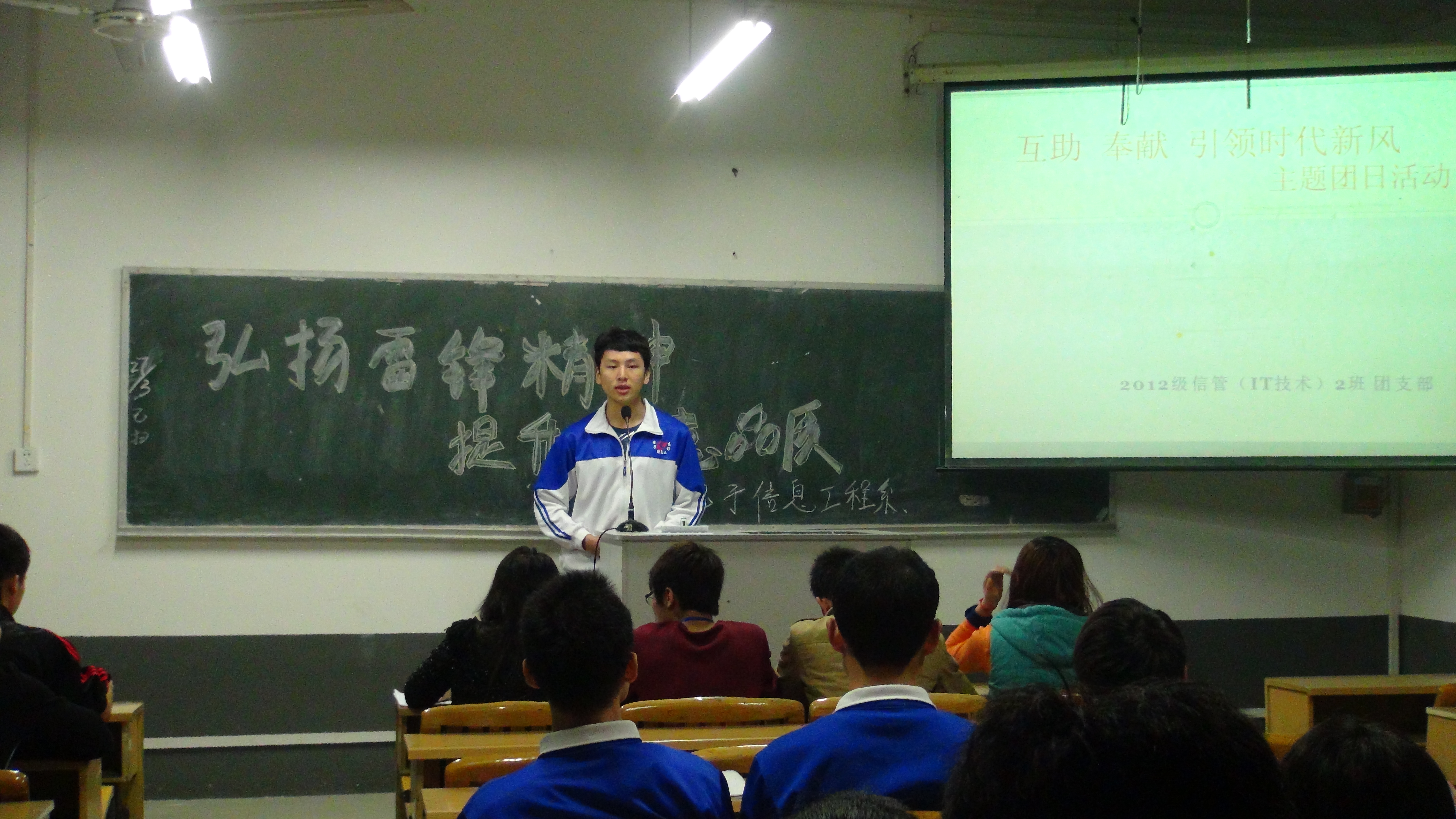 2013年3月27日晚七点半,柳州职业技术学院电子信息工程系团委学生会组织部组织该系12级各班同学在文华楼105教室开展了“弘扬雷锋精神 提高道德品质”为主题的团日活动总结汇报会,该系团委组织部部长覃秋凤、副部长韦丽媛及组织部干事担任本次活动评委,评选出优秀代表队参加学院团日活动评比。本次活动由组织部干事张月泽主持。