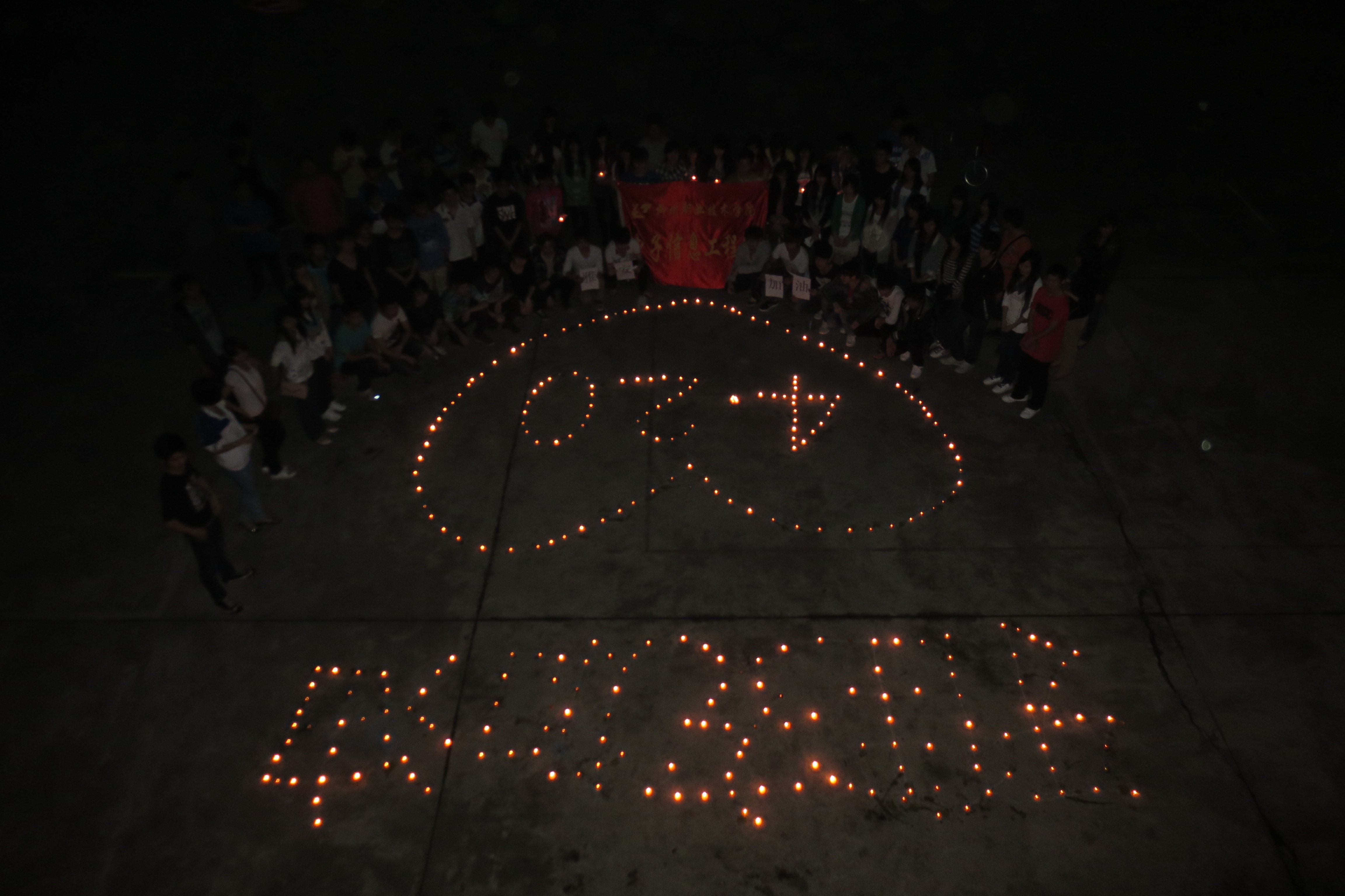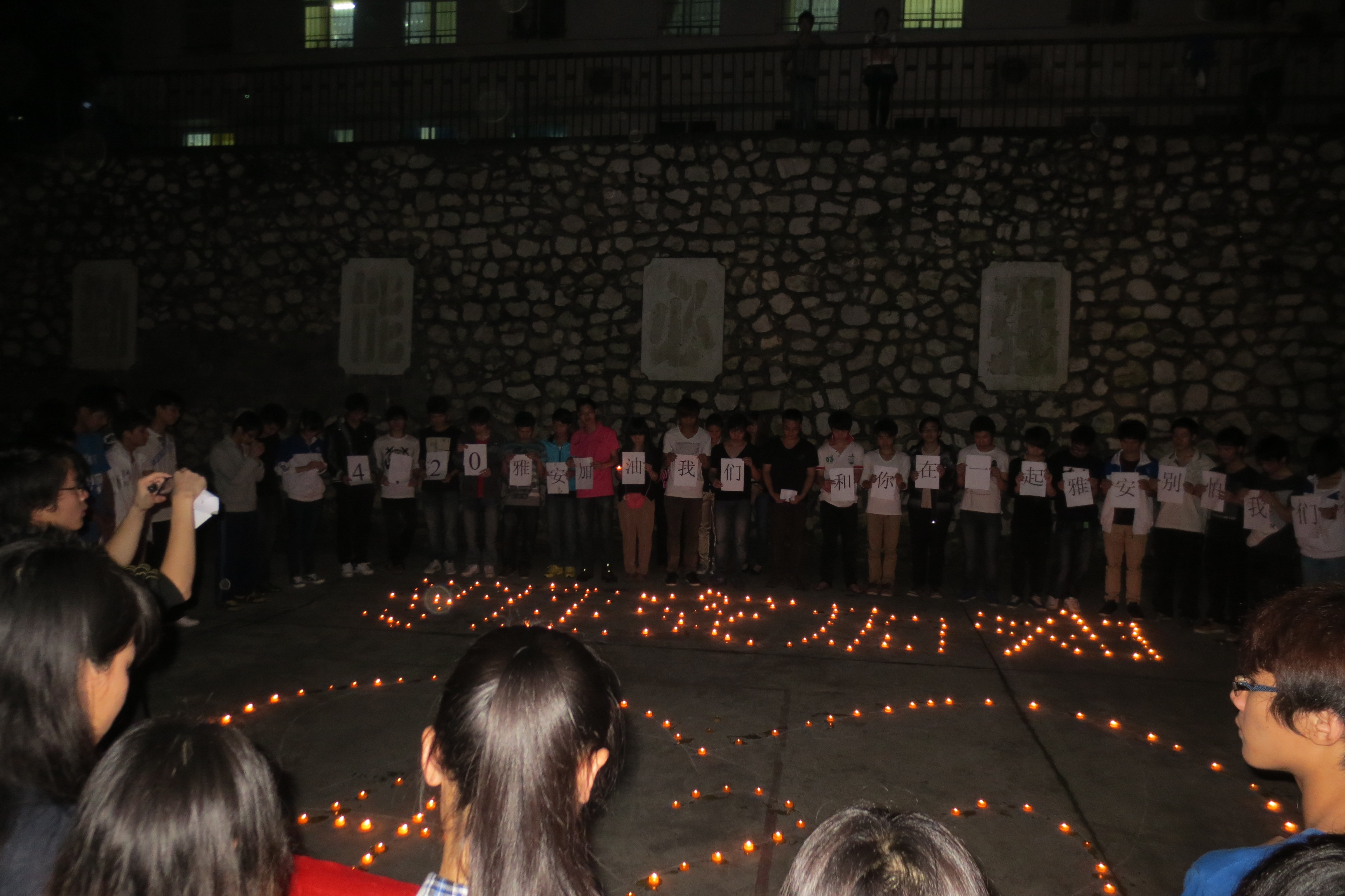 五年前的5.12汶川8.0级地震灾难深深的触动了每一个人的心,五年后的4.20雅安地震再次深深地牵动了人们的心,让人无时无刻不牵挂着雅安灾区的人们,祈福雅安人民能够平安无事,早日脱离困境。同学们点燃“4.20雅安”等字样的蜡烛,为四川雅安地震灾区同胞祈福、加油?!拔颐怯肽阃?,遥望那看不见的牵挂思念在蔓延,灰色的天空流下眼泪信念被灌溉,你睁开眼看啊繁星在乌云中挣扎,手牵着手我们冲破这黑暗,你睁开眼看啊,看一看身边的爱人,没有什么可以让我把手放开,与你同在风雨中每一天,坚强的信念是梦魇的祭奠,与你同在生命中的每一天,拥抱着明天希望就在眼前,雅安加油!我们与你同在。”同学们高声颂读着祝词,希望大家的祝愿伴着烛光飘向远方,飘向雅安,飘向雅安人民?;疃詈?,同学们发起了三分钟默哀行动,全体同学一起为雅安人民默哀。