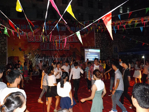 2013年10月13日晚,由贸易与旅游管理系分团委学生会主办的“舞动青春,活力贸旅,快乐无限”迎新舞会在学院本部D区竞择楼前火热开场。贸易与旅游管理系学生科科长陈月明、分团委学生会书记夏佩亲临现场与2013级新生同乐。