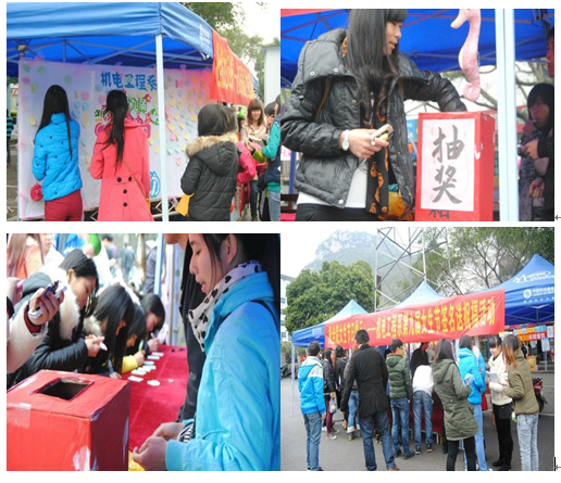 3月7日上午11时,学院A区行政楼旁,音乐声阵阵,祝愿全院女生节日快乐的广播声接连不断,悬挂在帐篷上的可爱娃娃、放置在抽奖箱旁的棒棒糖和饮料等小礼品将路过的同学都吸引过来,不管男生还是女生,拿起便签条认真写起祝福语,有的同学抽奖得到娃娃,开心不已,也有拿到棒棒糖心里美滋滋将祝福贴上展板的,还有男生将祝福语拍下立即发微博的……尽管当天细雨蒙蒙,但同学们热情不减,参与抽奖和送祝福的同学也络绎不绝,活动持续两个多小时,展板上贴满祝福语,小礼品也全部送出。