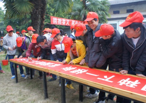 同学们在植树活动宣传横幅下宣誓并在学生会的组织下进行了签名,随后在梁书记、阎科长、各辅导员的亲自带领下展开了本次植树活动。活动中,同学们带上工具和树苗,积极挖土,各自种下自己班的班级树苗。有些班级的志愿者甚至自制了卡片,许下心愿和系上丝带,挂在了树苗上。