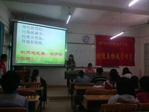 财经与物流管理系分团委学生会于2014年4月30日在德润楼101教室举行了主题为“环保,从点滴做起”的环保卫生评比活动,并于5月6日进行了颁奖活动,此次活动邀请了环境?;ば峄岢ず瘟?、副会长鲜亚琴到现场担任评委。
