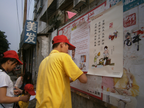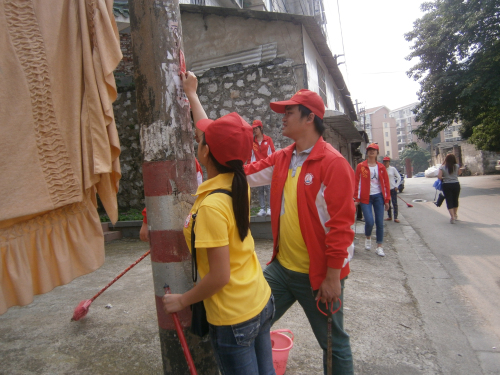当天下午,20余名志愿者们分成两个小分队,在蝴蝶山社区进行“中国风宣传活动”和“美化社区,还社区一片净土”活动。在炎热的天气下,一部分志愿者将关于 “我们的价值观”“健康中国行小贴士”“防灾减灾”的宣传单张贴到宣传栏;另一部分志愿者为社区的草坪除掉杂草,清扫地上的果皮纸屑和清除墙上的牛皮癣......