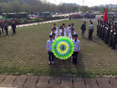 •      早上8点,学生们集中于达理楼前,不久队伍抵达烈士陵园山脚下,苍松翠柏的烈士陵园,寄托着一个时代对数以万计的先烈们的缅怀。先烈们的生命虽已逝去,但他们的精神万古长青,永垂不朽,值得我们永远铭记在心。学生们怀着崇敬的心情,走过长长的云梯,来到烈士纪念碑前,听讲解员诉说着血雨腥风的战争岁月。同学们低着头,为英勇战斗的革命烈士默哀三分钟,表达了对烈士、英雄的思念,并将手中的白花敬献在英烈们的墓碑前。