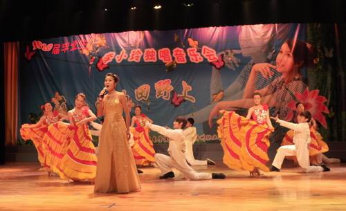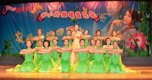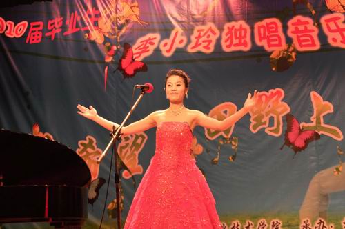 2010年3月30日晚,柳州职业技术学院音乐表演厅歌声嘹亮,掌声不断,热情的听众不时上台献花。在此举行的是我院2010届毕业生李小玲“在希望的田野上”毕业独唱音乐会暨《声乐》国家精品课程教学成果汇报会。李小玲展示了大学近三年学习的扎实功底和歌唱实力,给观众带来高尚的艺术享受。