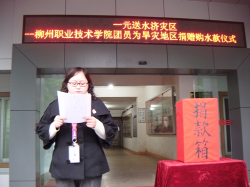 2010年3月30日下午,由学院学生工作处、团委组织的“一元送水济灾区”——柳州职业技术学院团员为旱灾地区捐赠购水款仪式在学院A区行政办公楼前举行,积极响应团中央、全国少工委的号召,“每一名团员青年为灾区捐献一瓶水”的倡议,组织动员广大共青团员和少先队员投身抗旱救灾斗争。
