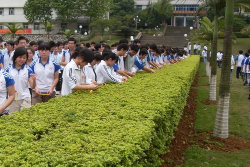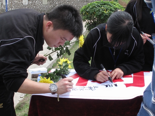 同学们在横幅上签名表达祝福
